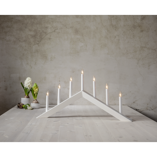 Modern vit adventsljusstake med fasade former. Ljusstaken har 7 ljuskällor (ingår) med varmvitt sken. En dekorativ adventsljusstake som sprider julstämning i hemmet. Mått: B 69 x H 36 x D 7 cm Sladdlängd: 1,8 m IP-klass: IP 20