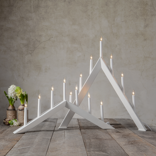 Modern vit adventsljusstake med fasade former. Ljusstaken har 7 ljuskällor (ingår) med varmvitt sken. En dekorativ adventsljusstake som sprider julstämning i hemmet.