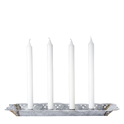 Tidlös ljusstake / adventsljusstake i gråvit metall med plats för fyra stycken kronljus. Material: Galvaniserad plåt Färg: Gråvit med inslag av rost. Se bild. Mått: L 44 x B 18 x H 3.5 cm