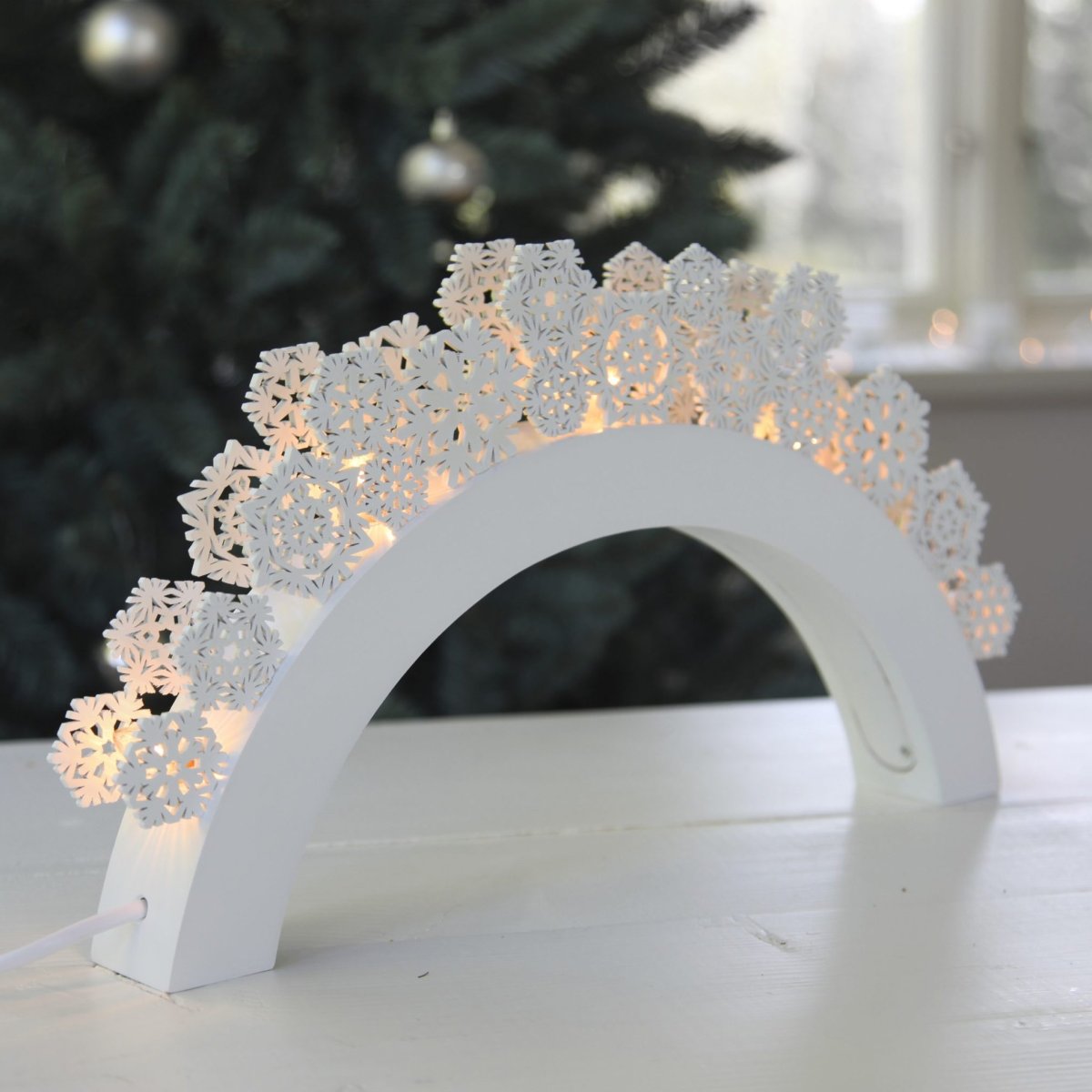 Vit träljusstake fint dekorerad med snöflingor. Ljusstaken har 5 ljuskällor (ingår) med varmvitt sken. En dekorativ adventsljusstake som sprider julstämning i hemmet. Mått: B 41 x H 22 x D 5 cm Sladdlängd: 1,8 m