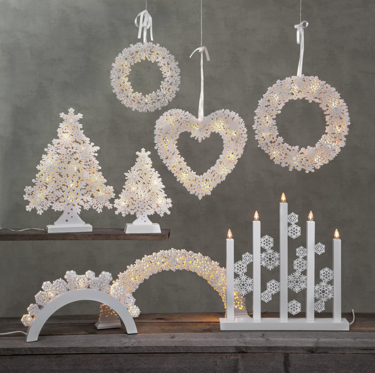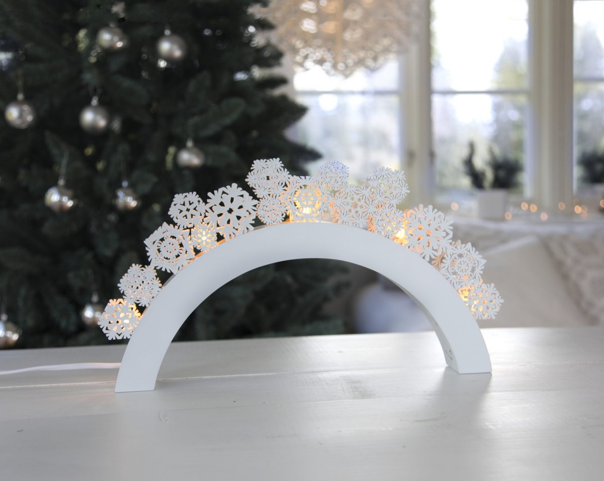 Vit träljusstake fint dekorerad med snöflingor. Ljusstaken har 5 ljuskällor (ingår) med varmvitt sken. En dekorativ adventsljusstake som sprider julstämning i hemmet.