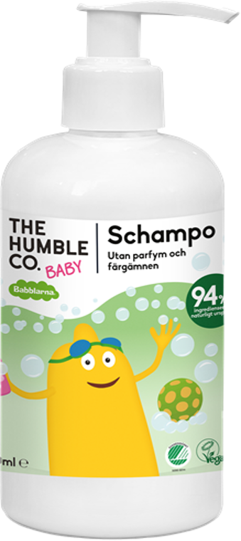 Ett Schampo helt utan parfym och färgämnen i en lekfull Babblarna flaska med pumpfunktion. En mild formula, lämplig för känslig hud, fri från doft och parabener. 93% ingredienser av naturligt ursprung. SLS-fri. Svanenmärkt. Vegansk. Flaskan är tillverkad av 50% rPet.