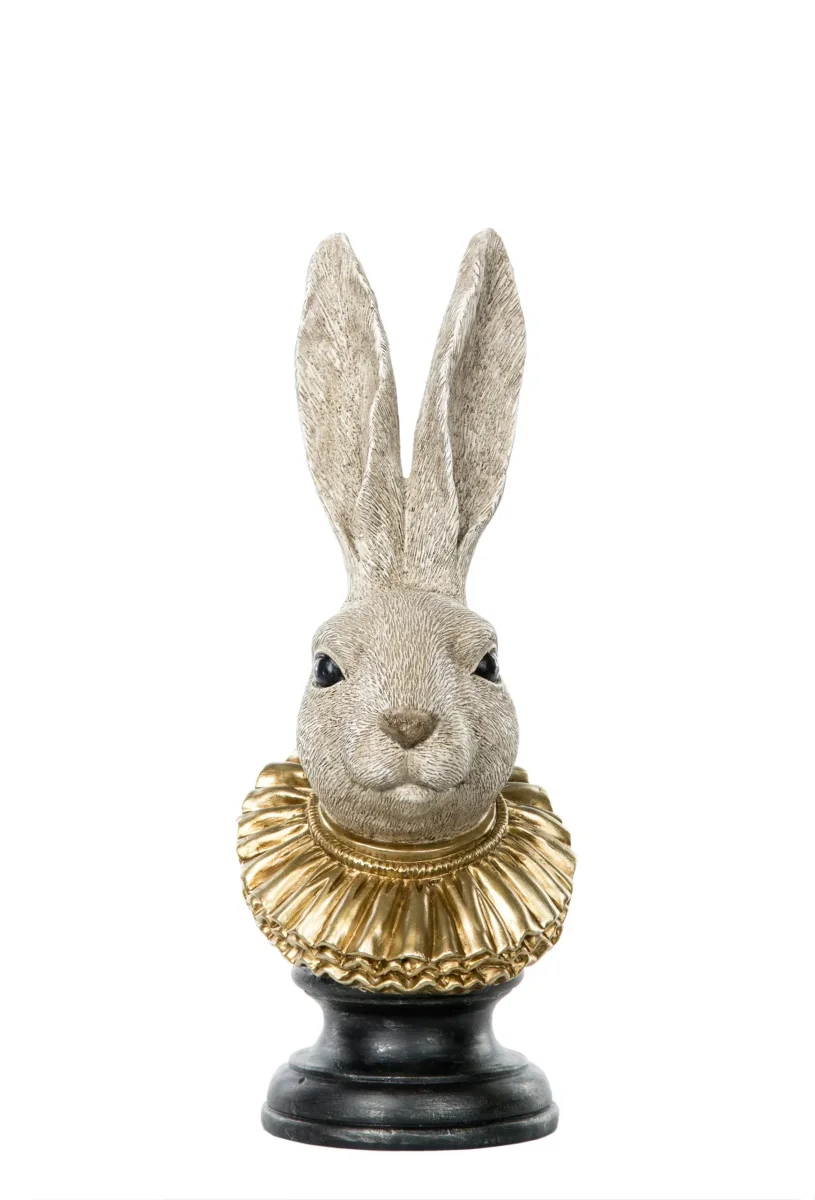 En maffig dekoration i form av ett kaninhuvud med krage i svart och guld. En dekoration utöver det vanliga! Mått: B 18 x Höjd 50 cm Material: Polyresin