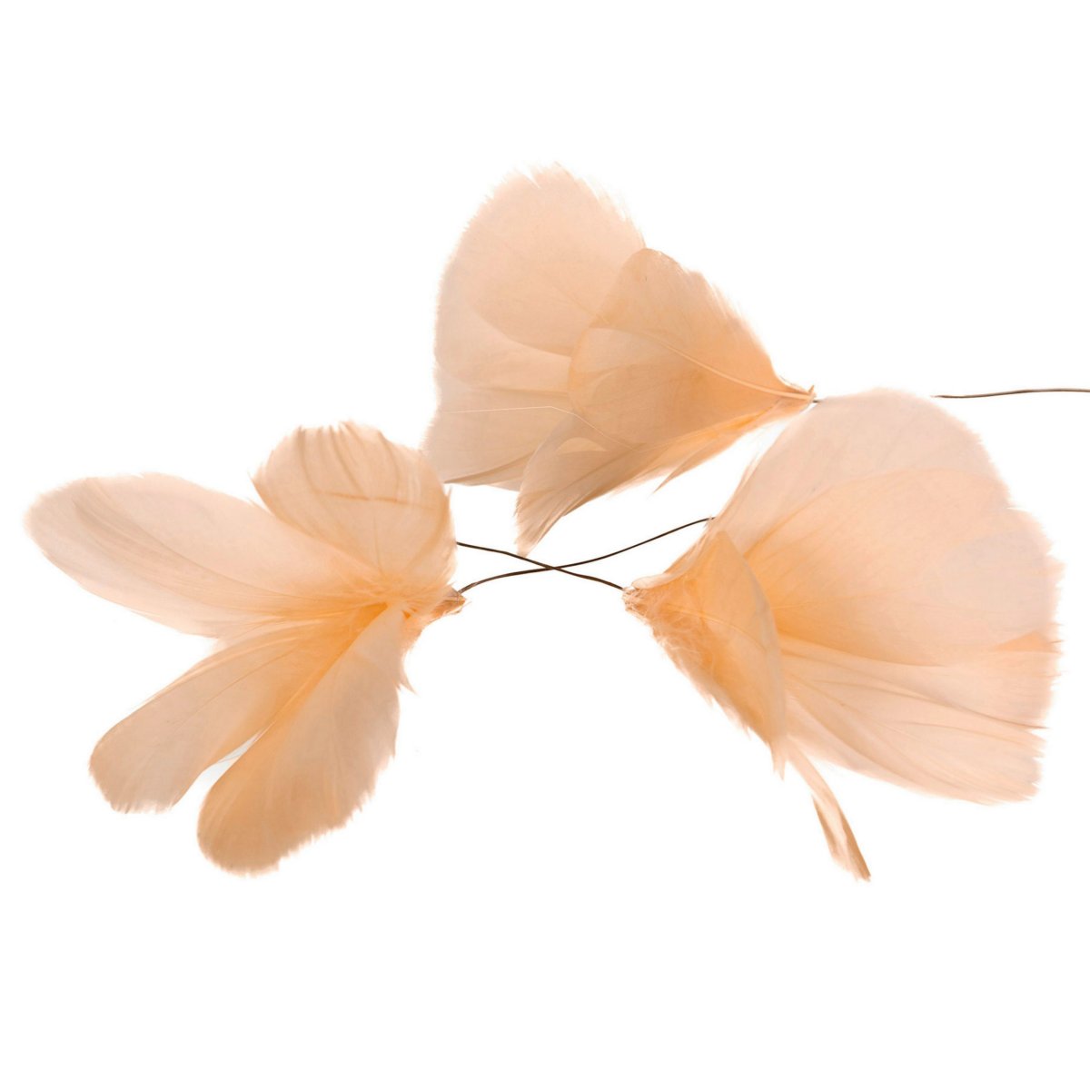 Tre vackra fjädrar som är formade som en blomma i ett knippe. Fina att fästa i påskriset eller annan kvist, i ett blomsterarrangemang eller bukett. Alla fjäderknippen är trådade och lätta att fästa. Fjädrarna är delvis äkta och plockade från döda djur där fjädrarna har lossnat. Material: Fjädrar och ståltråd Mått: Ca 4,5 x 3 cm + ståltråd Antal: Säljs i set om 12 st Färg: Ljus aprikos