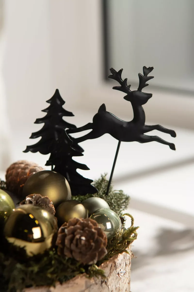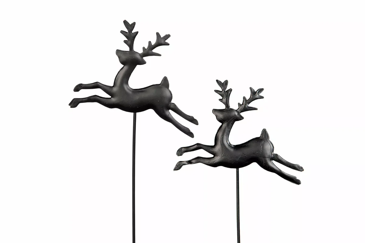 Söt hjort på pinne att sticka ner i en kruka / krans / blomarrangemang. Tål vatten. Säljs i 2-pack. Färg: Svart Material: Metall Mått: Ca 7 x 5 cm cm + pinne 13 cm