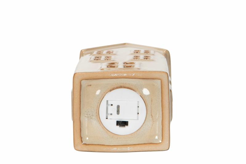 Mysigt ljushus / huslykta med ledbelysning i beige keramik. Dekorera med huset på en hylla eller placera på en skänk, den passar perfekt hela den mörka årstiden och blir en stämningsfull dekoration till advent och jul. Lyktan drivs av 3 st LR44 batterier ( ingår ej ). Mått: 7 x 6 x H 17 cm