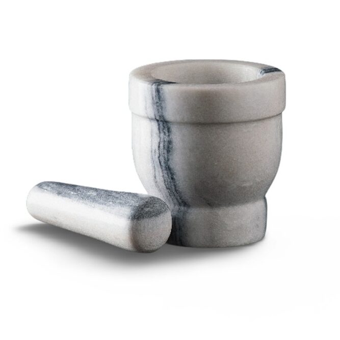 Mått/Innehåll: Morteln är 10,7×10 cm, stöten är 12,4×3,5 cm Färg/Doft: Vit/grå Material: Marmor