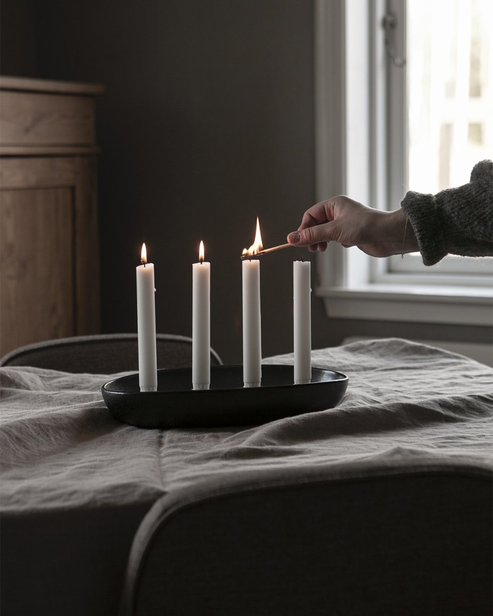 Oval avlång adventsljusstake / ljusfat med 4 ljushållare i svart blank keramik. Fyll ljusstaken med mossa eller nötter till vintern. Passar fint till julens alla dukningar på matbordet och skapar en mysig stämning under årets alla mörka dagar. Eftersom produkten är handgjord kan små gropar eller prickar förekomma i keramiken, och det kan skilja lite från produktbilden.