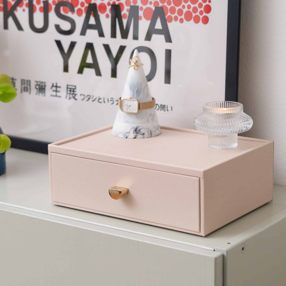 Der er mange løsninger på opbevaring af smykker og makeup, men ingen er helt så gode som Rose! Hun er en skøn, stabelbar skuffe, som kan passe godt på dine mest dyrebare ejendele. Med hendes smarte inddelere kan du let holde styr på tingene, og så kan du stable flere skuffer ovenpå, hvis du mangler plads!