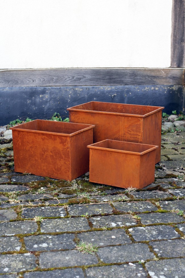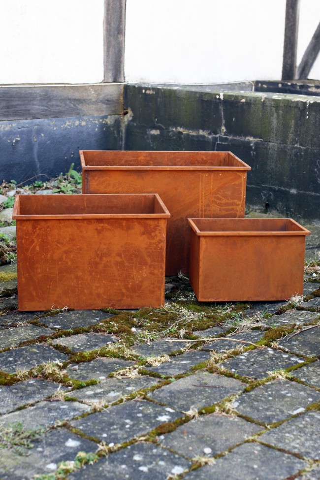 Maffiga krukor i rostig metall med vikt kant upptill i rektangulär form. Mått: Liten L 32 x B 23 x H 20 cm / Mellan L 42 x B 28 x H 27 cm / Stor L 52 x B 32 x H 35 cm